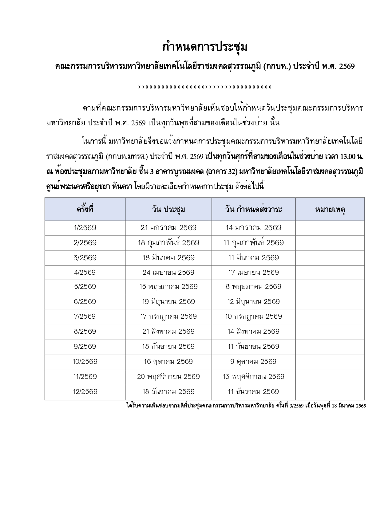 กำหนดการประชุมคณะกรรมการบริหารมหาวิทยาลัยเทคโนโลยีราชมงคลสุวรรณภูมิ (กกบห.) ประจำปี พ.ศ.2569